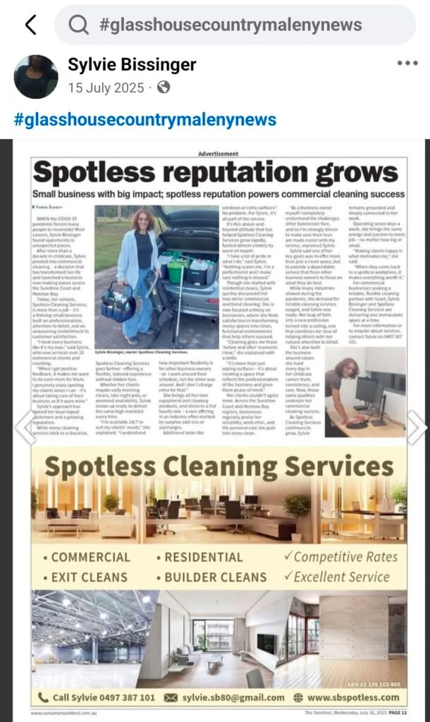 Spotless was recently featured in a Sunshine Coast newspaper article highlighting our growth and reputation within the community. The piece shared our journey from a small residential service to a respected commercial cleaning provider known for reliability and strong word-of-mouth referrals.